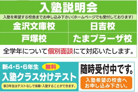 ※日吉校の4年生・5年生の残席数がわずかとなっております。入塾説明会は予定しておりません。個別面談にてご対応させて頂きます。お気軽にお問い合わせください。