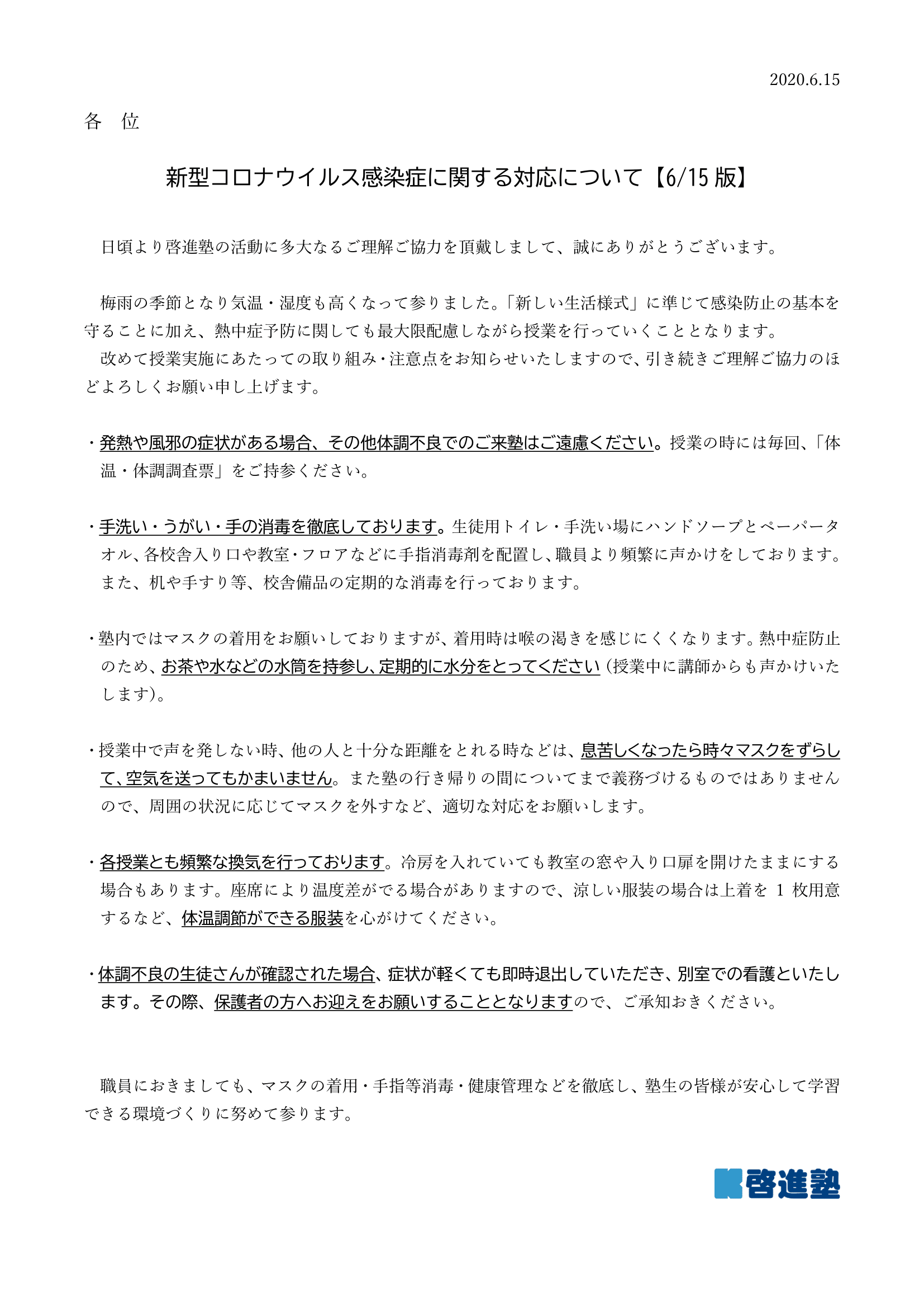 塾内でのマスク着用、手指消毒、三密を避ける等について、塾生の皆様への啓発・指導も行いつつ、状況に応じ適切な対応をして参ります。