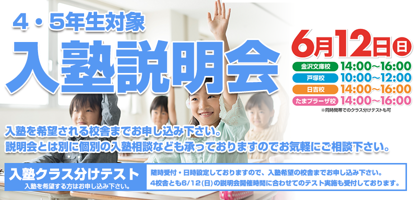 説明会開催時間に合わせての入塾クラス分けテストも受付しております。