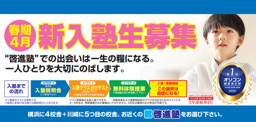 啓進塾は中学受験専門塾です。麻布、栄光学園、聖光学院、浅野、フェリス、湘南白百合などに多数合格者を出しています。金沢文庫校、戸塚校、日吉校、たまプラーザ校、川崎校があります。