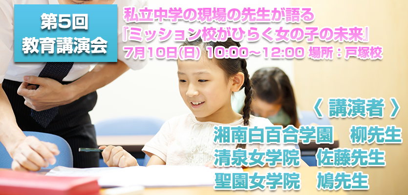 第5回の講演会として、湘南白百合学園・清泉女学院・聖園女学院の先生においでいただき、『ミッション校がひらく女の子の未来』と題して、講演とパネルディスカッションをお願いいたしました。おいでいただく先生は現在、現場で女子教育に携わり、子供たちの成長を見守っている先生方です。今の女の子がどのように成長していくのか、今後どのように接したらよいのかのヒントを聞くことができると思います。