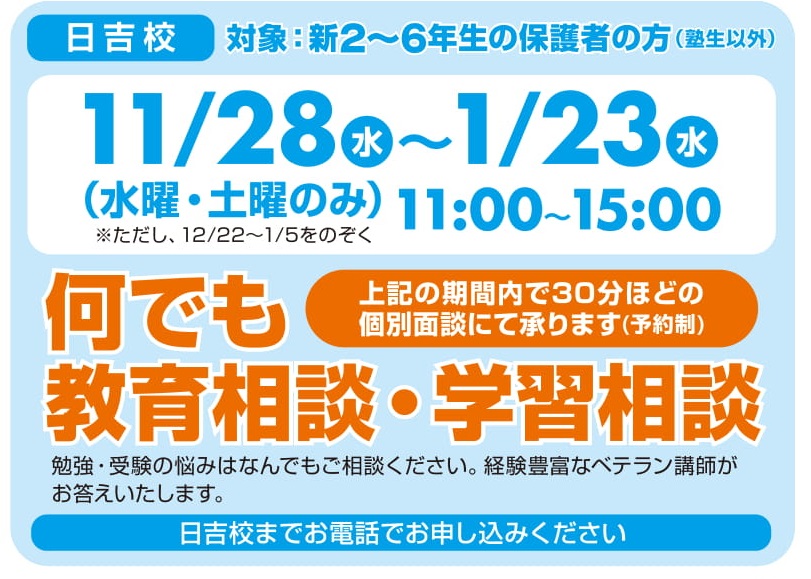 この度、広く、小学生をお持ちの保護者の方の様々なご相談をお受けすることにいたしました。中学受験をお考えの方もそうでない方も、小学生の学習についてお悩みのことをご相談ください。
